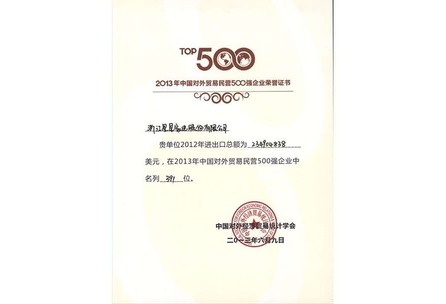 2013年中国对外贸易民营500强企业荣誉证书