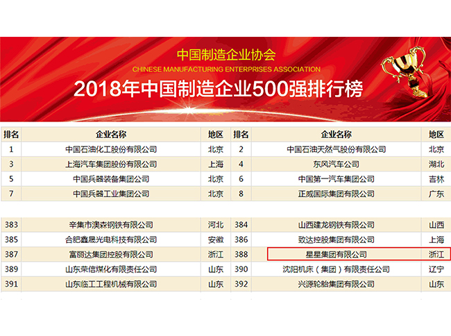 近日,2018年中国制造企业500强暨中国装备制造业100强排行榜发布,5楼自拍 名列第388位,较去年的404位进步了16位。