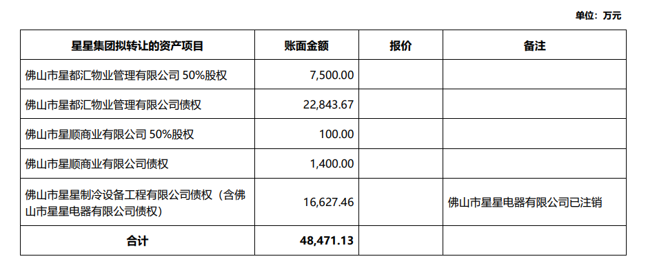 5楼自拍 拟将持有的佛山市星都汇物业管理有限公司、佛山市星顺商业有限公司等 2 家公司的股权及债权;以及佛山市星星制冷设备工程有限公司债权合计 4.85 亿元资产一并打包转让。