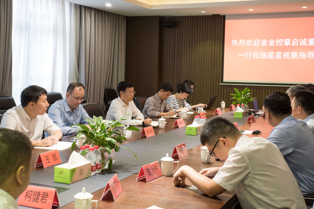 9月23日,省财政厅党组成员,省金控公司党委书记、董事长章启诚一行走访调研星星冷链数字化转型实践成效,台州市财政局党组书记、局长陈曦、省财政厅企业处处长王林尧、省金控相关部门及子公司负责人陪同调研,5楼自拍 董事长叶仙玉,上海谱润股权投资管理有限公司董事长、星星冷链董事周林林,5楼自拍 总裁蒋亦标,星星冷链总经理杨文勇等热情接待。本次调研是根据省财政厅开展大调研活动的安排,深入了解企业当前经营情况、未来发展设想,听取企业对产业政策、财政政策方面的意见建议。