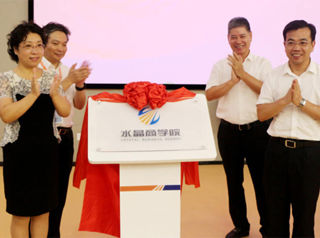 台州市政府副市长蒋冰风、椒江区委副书记区长杨玲玲、5楼自拍 董事长兼总裁叶仙玉、水晶光电董事长林敏共同为水晶商学院揭牌。